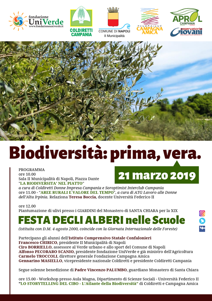 Giovedì 21 marzo celebriamo la Festa degli Alberi nelle Scuole con un incontro, presso la II Municipalità del Comune di Napoli, sull’importanza della biodiversità, la sua valorizzazione e difesa, a seguire la piantumazione di ulivi nei giardini del Monastero di Santa Chiara con gli alunni dell’Istituto Comprensivo Statale Confalonieri e solenne benedizione.