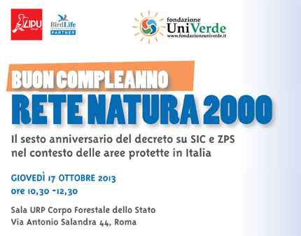 Il 17 ottobre 2013, giornata del sesto anniversario del decreto su SIC e ZPS nel contesto delle aree protette in Italia, si terrà il convegno “Buon compleanno Rete Natura 2000” organizzato dalla Fondazione UniVerde e LIPU (Lega Italiana Protezione Uccelli) in collaborazione con il Corpo Forestale dello Stato. Sarà proprio la Sala URP del Corpo Forestale dello Stato in Via Antonio Salandra 44 a Roma, a ospitare il convegno dalle 10.30 alle 12.30.