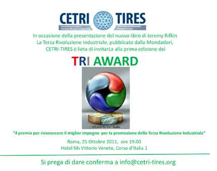 La Fondazione Univerde è lieta di comunicarVi che Martedì 25 Ottobre alle ore 19 presso l’hotel NH Vittorio Veneto in Corso d’Italia 1 a Roma si terrà la cerimonia di consegna dei “Tri Awards” riconoscimenti per l’impegno a sostegno della Terza Rivoluzione Industriale promossa dal CETRI –TIRES (Circolo Europeo per la Terza Rivoluzione Industriale). Conferirà i premi Jeremy Rifkin.