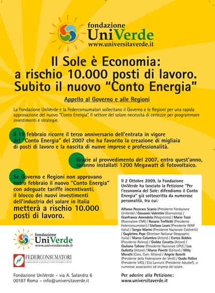La Fondazione UniVerde e la Federconsumatori sollecitano, attraverso un’inserzione pubblicata sul ‘Il Sole 24 ore‘ in occasione dell’anniversario della firma del Conto energia, il Governo e le Regioni per una rapida approvazione del nuovo “Conto Energia”. Il settore del solare necessita di certezze per programmare investimenti e strategie. Se Governo e Regioni non approvano entro febbraio il nuovo “Conto Energia” con adeguate tariffe incentivanti, il blocco dei nuovi investimenti dell’industria del solare in Italia metterà a rischio 10.000 posti di lavoro.