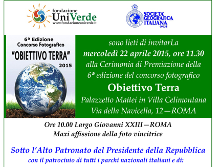 Si terrà mercoledì 22 aprile alle ore 11:30 la Cerimonia di premiazione della 6^ edizione del concorso fotografico “Obiettivo Terra” a Palazzetto Mattei in Villa Celimontana, Via della Navicella, 12 –ROMA.