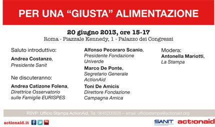 Si terrà il 20 giugno a Roma al Palazzo Congressi in Roma la Conferenza: “Per una giusta alimentazione” promossa da ActionAid cui parteciperà anche il Presidente della Fondazione UniVerde, Alfonso Pecoraro Scanio.
