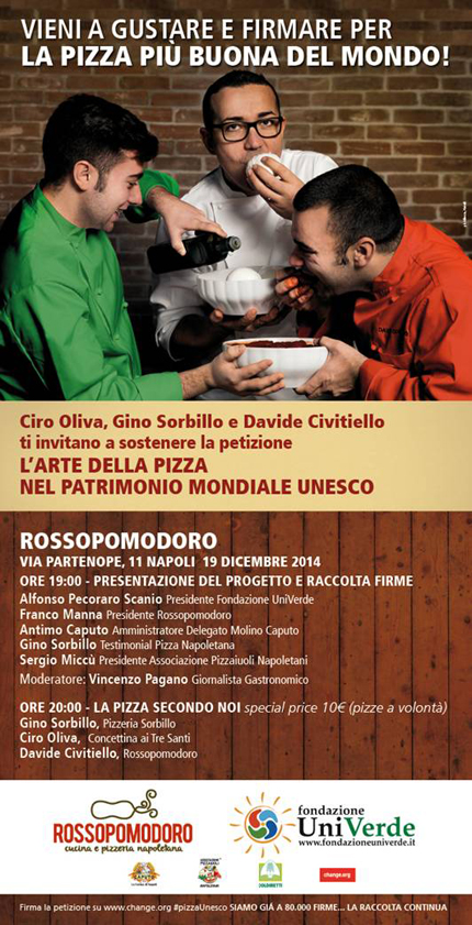 Venerdì 19 dicembre i tre maestri pizzaioli Gino Sorbillo, Ciro Oliva della Pizzeria Oliva – Concettina ai Tre Santi e Davide Civitiello di Rossopomodoro – Via Partenope promuoveranno la petizione #pizzaunesco. L’evento si terrà da Rossopomodoro a Napoli in via Partenope,11 dalle 20.00 dove i tre artisti della pizza si alterneranno al forno per deliziarci con le loro pizze ad uno special price di 10 € (pizza a volontà).