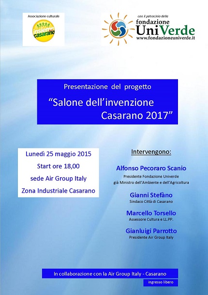 L’Associazione culturale Insieme Casarano, con il patrocinio della Fondazione UniVerde, presenterà il 25 maggio alle ore 18:00 il progetto: “Salone dell’invenzione Casarano 2017” alla sede Air Group Italy nella zona industriale di Casarano.