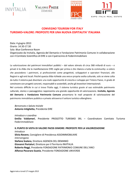 Per potenziare il turismo italiano, Invitalia, Agenzia del Demanio e Fondazione Patrimonio Comune presenteranno delle reali proposte di valorizzazione del patrimonio immobiliare pubblico e privato attraverso il settore turistico – alberghiero durante il convegno: “Tourism for Italy. Turismo=Valore: proposte per una nuova ospitalità italiana”, che si terrà il 4 giugno alla Blue Conference Room dell’EIRE (Expo Italia Real Estate), a Milano, a partire dalle 14:30.