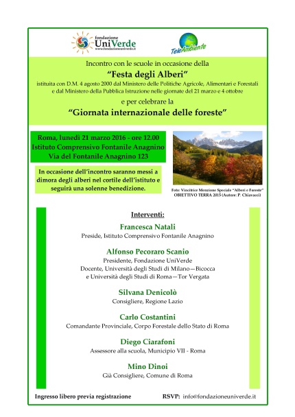 Si terrà lunedì 21 marzo l’incontro con le scuole in occasione della “Festa degli Alberi”, istituita con D.M. 4 agosto 2000 dal Ministero delle Politiche Agricole, Alimentari e Forestali e dal Ministero della Pubblica Istruzione nelle giornate del 21 marzo e 4 ottobre, e per celebrare la “Giornata internazionale delle foreste”.