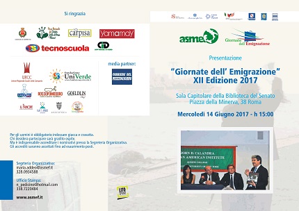 Asmef, Associazione Mezzogiorno Futuro, presenta l’ edizione 2017 di Giornate dell’Emigrazione mercoledì 14 giugno alle 15:00 presso la Sala Capitolare della Biblioteca del Senato in Roma, col presidente dell’ associazione Salvo Iavarone, i membri del direttivo e numerose personalità che interverranno alle interessanti tavole rotonde sul turismo di ritorno, sul merito ed il made in Italy e infine sulle ricche iniziative 2017 che l’associazione promuove.