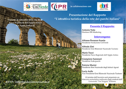 All’incontro interverranno: Alfonso Pecoraro Scanio, Presidente Fondazione UniVerde; Alfredo Zini, Presidente Ente Bilaterale Nazionale Turismo; Mario Tozzi, Presidente Parco Regionale dell’Appia Antica; Giampiero Sammuri, Presidente Federparchi; Patrizia Marini, Presidente Rete Nazionale degli Istituti Agrari; Lucia Anile, Vice Presidente Ente Bilaterale Nazionale Turismo.