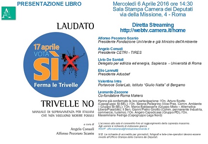 Sarà presentato mercoledì 6 Aprile alle ore 14:30 l’e book: “Laudato Sì Trivelle No”, Manuale di sopravvivenza per italiani che non vogliono morire fossili (Aracne editrice) a cura di Angelo Consoli, Presidente CETRI – TIRES  e Alfonso Pecoaro Scanio, Presidente Fondazione UniVerde e già Ministro dell’Ambiente.