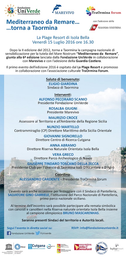 All’incontro, dopo il saluto di benvenuto del Sindaco di Taormina, Eligio Giardina, interverranno: Alfonso Pecoraro Scanio, Presidente della Fondazione Univerde; Rosalba Giugni, Presidente di Marevivo; Maurizio Croce, Assessore al Territorio e all’Ambiente della Regione Sicilia; il Contrammiraglio (CP) Nunzio Martello, Direttore Marittimo della Sicilia Orientale; Giovanni Signorello, Direttore del Centro di Ricerca Cutgana; Anna Abramo, Direttore della Riserva Naturale Orientata Isola Bella; Vera Greco, Direttore del Parco Archeologico di Naxos e Giuseppe Tindaro Toscano Della Zecca, Presidente del Club per l’ Unesco di Taormina Valli D’Alcantara e D’Agrò.