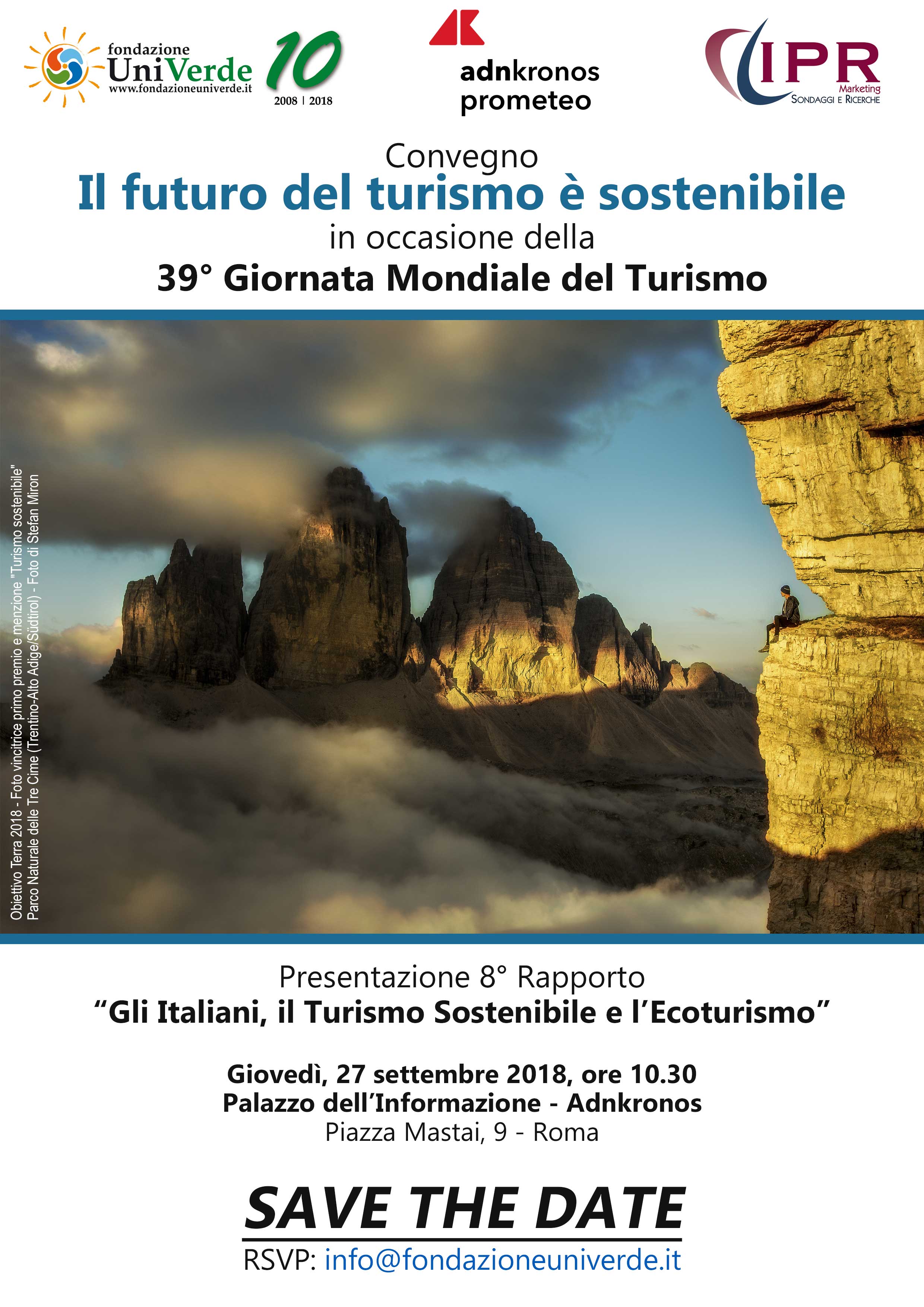Sarà presentato Giovedì 27 settembre 2018, in occasione della 39° Giornata Mondiale del Turismo, l’8° Rapporto “Gli italiani, il Turismo Sostenibile e l’Ecoturismo” realizzato dalla Fondazione UniVerde in collaborazione con IPR Marketing. I dati verranno divulgati al convegno “Il futuro del turismo è sostenibile” che si terrà presso Palazzo dell’Informazione – Adnkronos (Piazza Mastai, 9 – Roma).