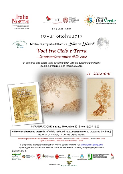 Dal 10 al 21 ottobre 2015 ad Albano Laziale (RM) presso Palazzo Lercari, sede del Museo Diocesano, si svolgerà la mostra-evento “ Voci tra Cielo e Terra… la misteriosa unità delle cose ”, un percorso di relazioni tra la passione degli ulivi e la passione per gli ulivi, ideato ed organizzato dal dott. Maurizio Manzo, co-promosso da Italia Nostra onlus (sezione di Campobasso), Fondazione UniVerde e LILT (Lega Italiana per la Lotta contro i Tumori – sezione provinciale di Roma).