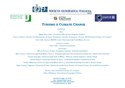 Si terrà giovedì 25 maggio alle ore 10.00 il workshop: “Turismo e cambiamento climatico” organizzato dalla Società Geografica Italiana, in collaborazione con Università di Roma “Tor Vergata”, centro di ricerca Marhe dell’Università di Milano-Bicocca e Fondazione Univerde.