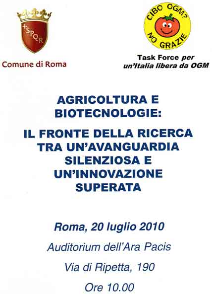 Per un’Italia libera dagli OGM, il 20 luglio all’Auditorium Ara Pacis alle 10 si terrà l’incontro su l tema: Agricoltura e biotecnologie promosso dalla Task Force No OGM e dal comune di Roma a cui interverrà anche Alfonso Pecoraro Scanio, presidente della Fondazione UniVerde.
