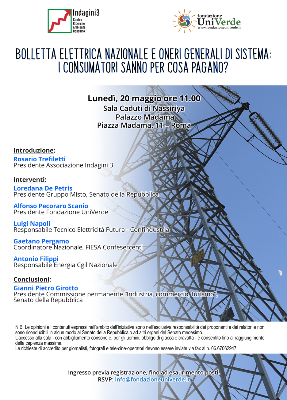 Si svolge a Roma, lunedì 20 maggio 2019, ore 11:00, alla Sala Caduti di Nassiriya di Palazzo Madama (Piazza Madama, 11), il convegno dal titolo “Bolletta elettrica nazionale e oneri generali di sistema: i consumatori sanno per cosa pagano?”, promosso da Indagini3 – Centro Ricerche Ambiente Consumo e da Fondazione UniVerde. Ingresso libero previa registrazione, fino ad esaurimento posti.