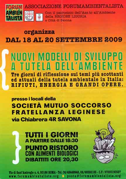 Dal 18 al 20 settembre, l’Associazione Forumambientalista organizza tre giorni di riflessione sui temi più importanti legati all’ambiente in Italia: Rifiuti, Energia e Grandi opere. L’incontro dal titolo: “Nuovi modelli di sviluppo a tutela dell’ambiente” si svolgerà in via Chiabrera a Savona. Venerdì 18 interverrà anche il Presidente della Fondazione UniVerde, Alfonso Pecoraro Scanio sul tema: “Energia pulita e sicura per le nostre regioni”.